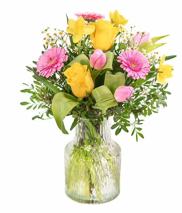 Spring Cheer is a fresh and uplifting bouquet filled with pink tulips, vibrant pink germini, sunny yellow daffodils and cheerful yellow roses. Accented with delicate matricaria and fresh pistache greenery, it’s a bright seasonal arrangement designed to bring a smile this Mother’s Day.