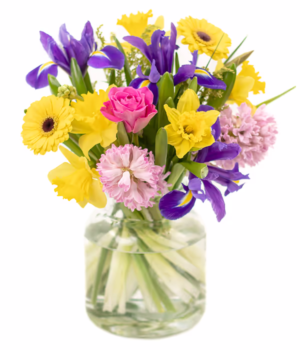 Bursting with yellow germini, pink roses and bold blue iris, this bouquet is perfect for sending a little sunshine to someone’s door.
