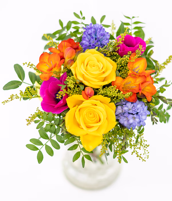 This vibrant bouquet features cheerful yellow roses paired with bold cerise anemones, orange freesias, and fragrant blue hyacinths. Accented with solidaster and fresh pistache greenery, it’s a beautifully bold arrangement designed to make someone smile.