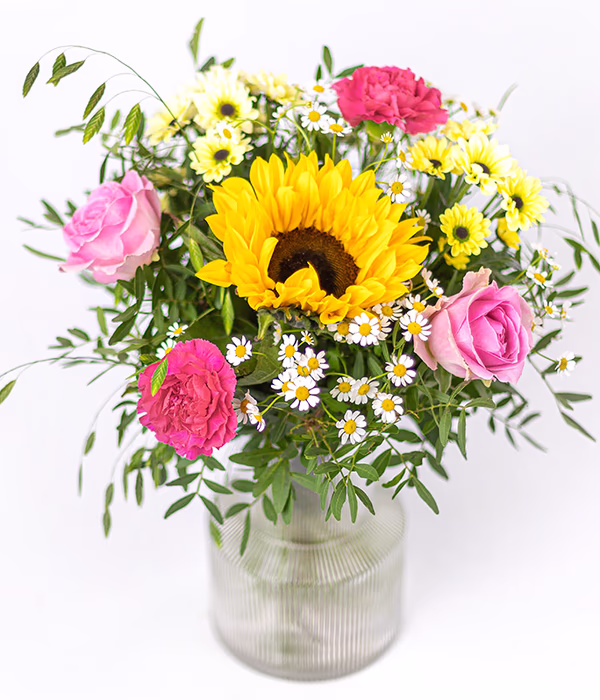 Summer Garden is a bright and cheerful bouquet featuring a bold sunflower at its heart, surrounded by soft pink roses, vibrant carnations and delicate white gypsophila. Accented with fresh greenery and seasonal blooms, it captures the natural beauty of a sunny garden in full bloom.