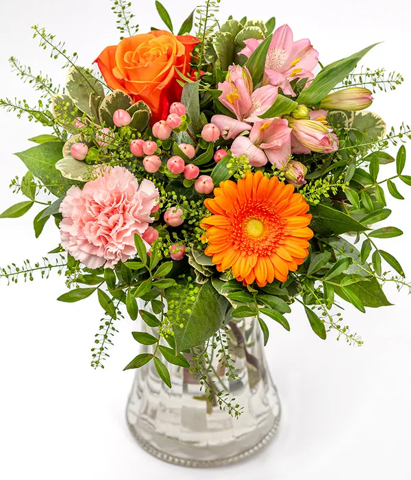 Sunset Glow is a warm and radiant bouquet bursting with orange roses and bold orange germini, balanced by pale pink carnations and alstroemeria. With fresh eucalyptus, hypericum berries and seasonal greenery, this vibrant arrangement captures the beauty of a glowing spring evening.