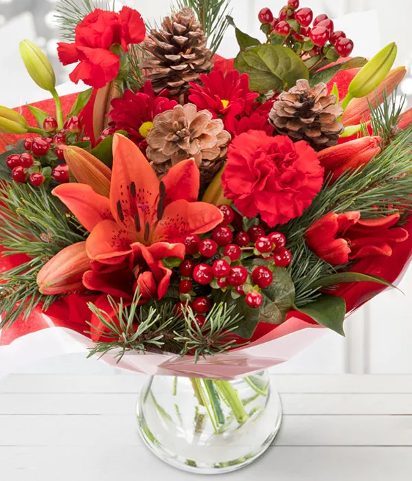 This special Christmas bouquet, inspired by the charm of winter walks on crisp, sunny days, beautifully combines the elegance of rich red carnations and fragrant red lilies with lush green foliage. Accented with earthy pine cones and hypericum berries, this festive arrangement is a true masterpiece. Expertly arranged and delivered via a tracked courier service, the bouquet arrives in bud to ensure lasting freshness. Share the indescribable joy of the season with a gift that speaks from the heart—at a price you’ll love.
